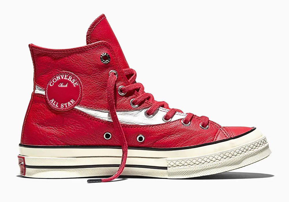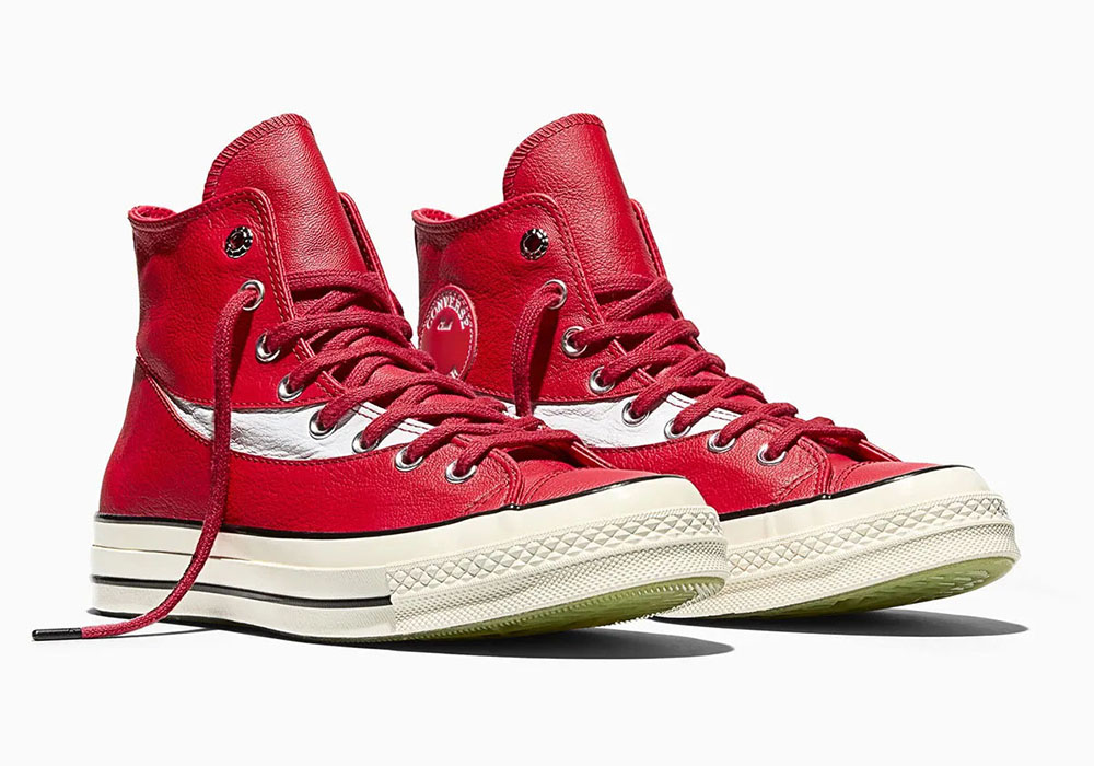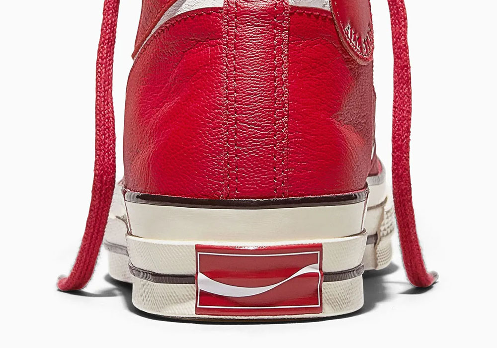 The collection includes a red leather Chuck 70 and four canvas Chuck Taylor All Stars in red, black, grey, and white. The red Chuck 70 will be the first to drop. Its leather upper is accented by an extra panel forming the Coca-Cola script logo, stretching from the heel and wrapping around the bottom two eyelets. The outsoles are inspired by the pale green, semi-translucent shade of classic Coca-Cola glass bottles. The insoles feature playful soda-themed graphics, while branded circles on the inner sides take cues from bottle caps.
