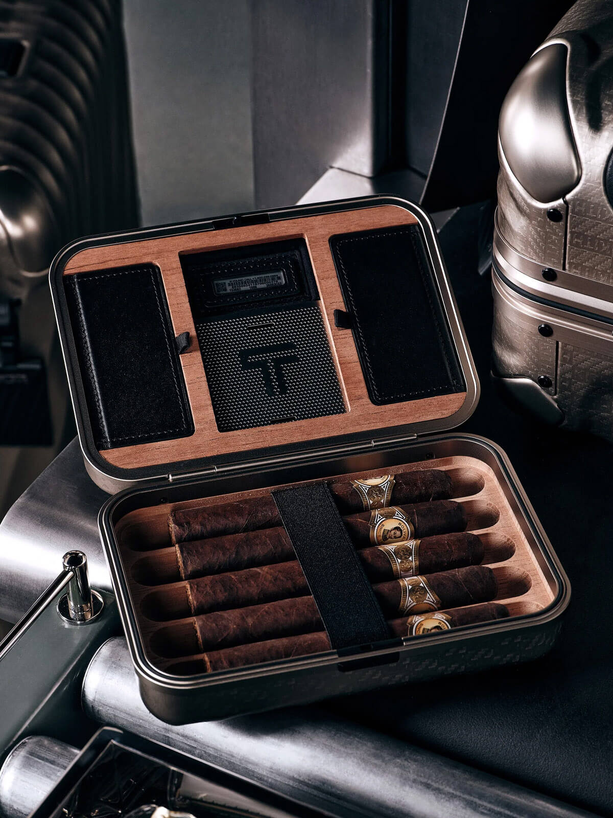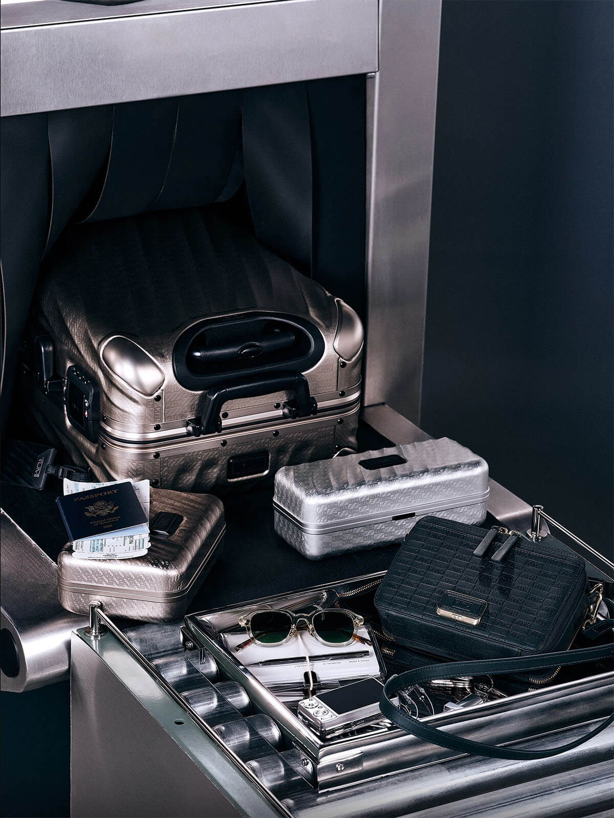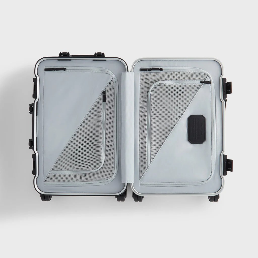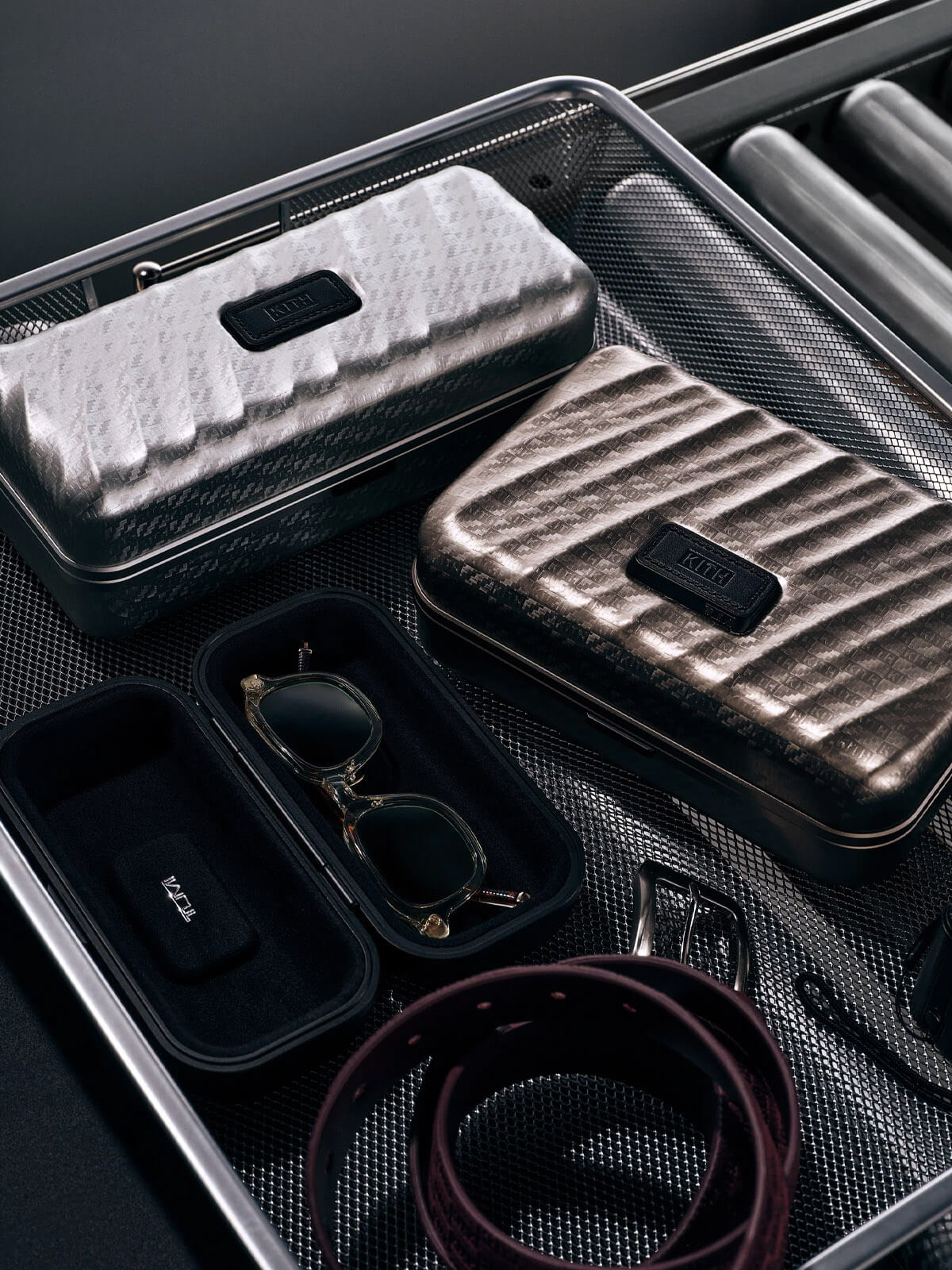 At the center of the collection is a curated lineup of six aluminum rolling cases crafted from TUMI’s signature aircraft-grade material. Available in a range of sizes — from International Carry On to Short Trip, Extended Trip, and Rolling Trunk — each piece preserves the sculpted contours of the 19 Degree design and features subtle Kith monogram embossing. Built for endurance, every suitcase includes dual TSA locks, a precision-fit frame, interior dividers, hanger brackets, protective bumpers, smooth dual-spinning wheels, and a two-stage telescopic handle. Returning favorites from the first collaboration — such as the Cigar Case, Sunglass Case, and Watch Case — reappear with aluminum shells and refined Kith detailing, bridging past and present editions.
