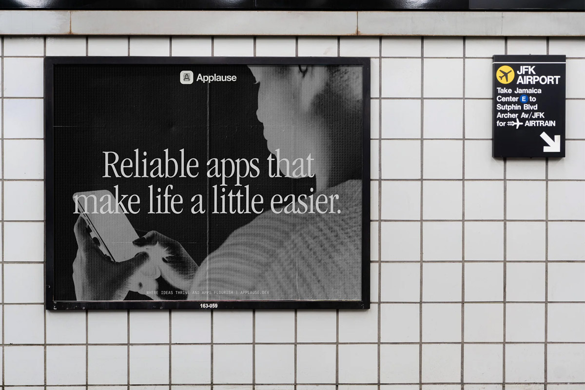 Guided by Applause’s core values of simplicity and honesty, the typographic system is built on open-source fonts that are accessible and unpretentious. DM Sans forms the wordmark with its clean, geometric structure, while Garamond, often used in bold 1980s American advertising, adds warmth and a conversational tone. JetBrains Mono completes the palette, evoking early computing’s raw, democratic spirit.