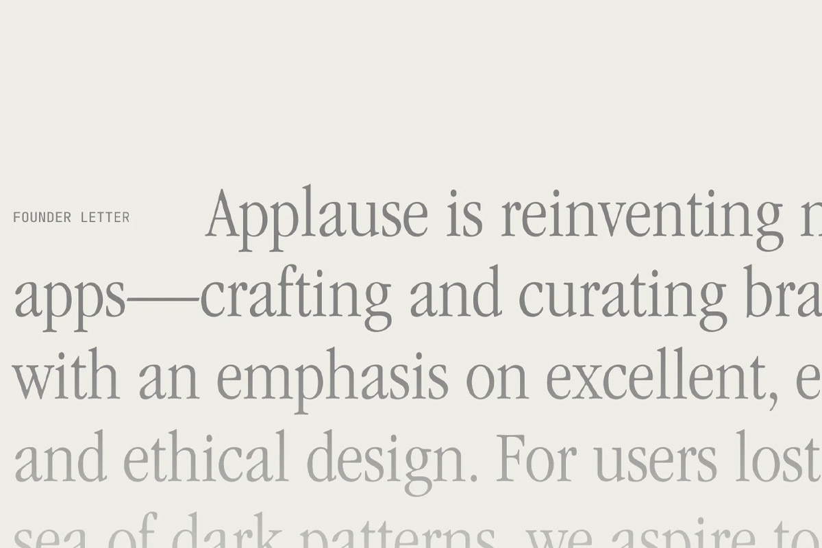 Applause is reshaping the world of app development, challenging the norms and redefining what it means to support indie apps. Unlike companies that buy apps just to strip and resell them, Applause is committed to transparency, ethical practices, and genuine care for developers, setting a new industry standard. Their brand and website, crafted by Studio Freight, reflect this mission, standing out in the Tech and SaaS space while nodding to the golden era of technology.